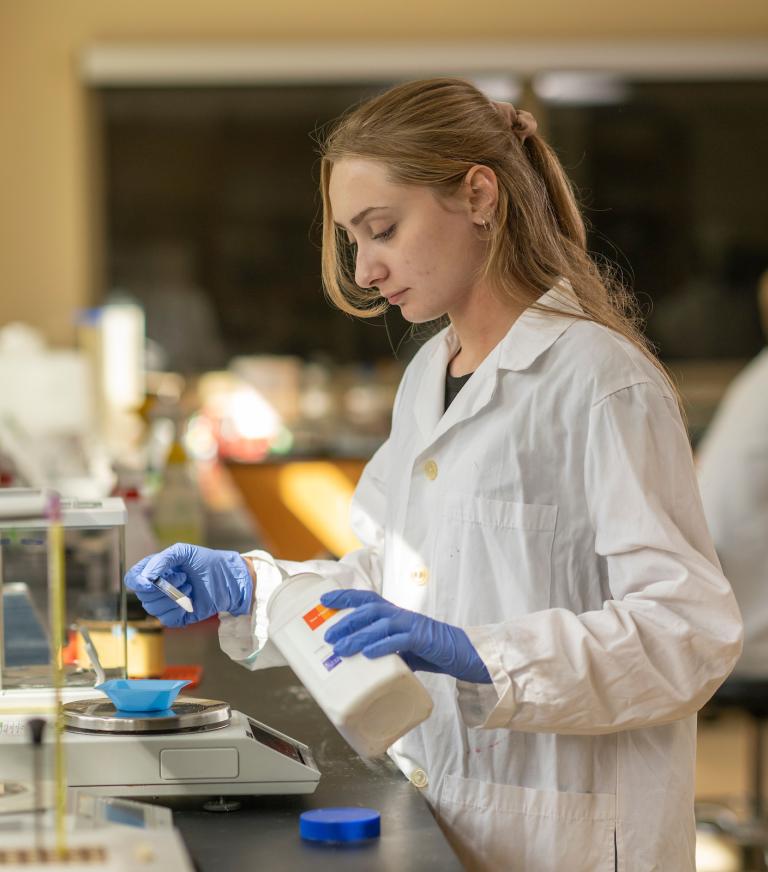 A student prepares to weigh a measured amount of a dry chemical powder.