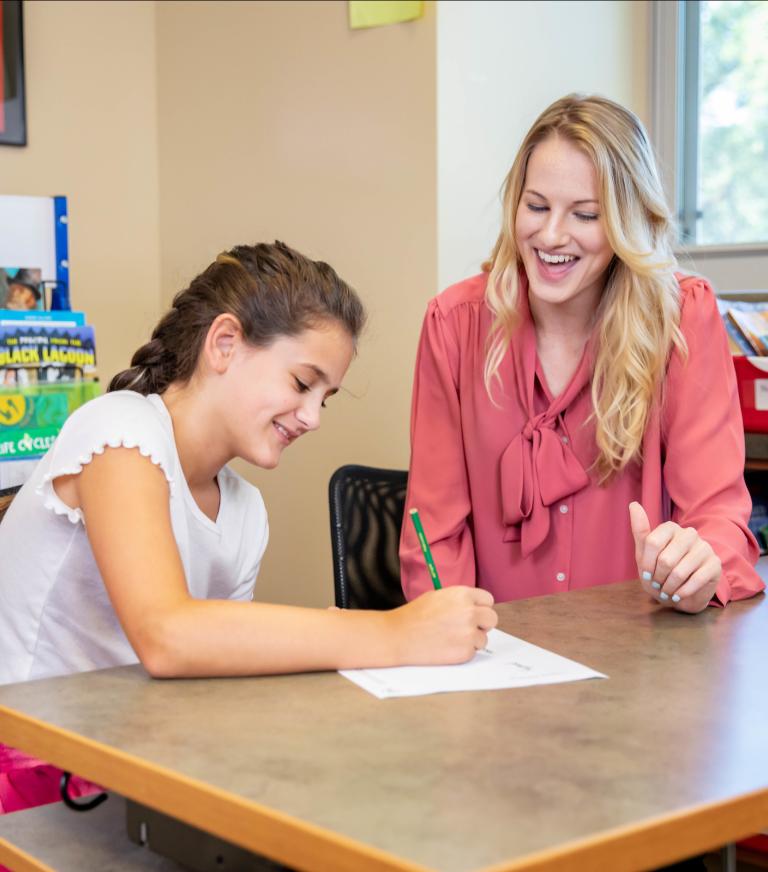 A student teacher teaching a student in the classroom.