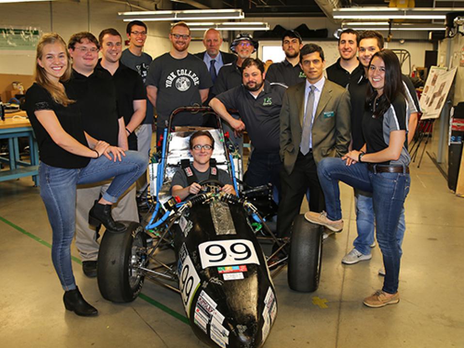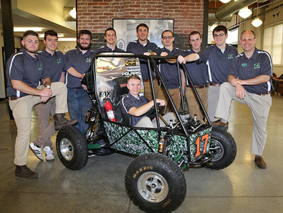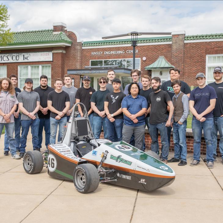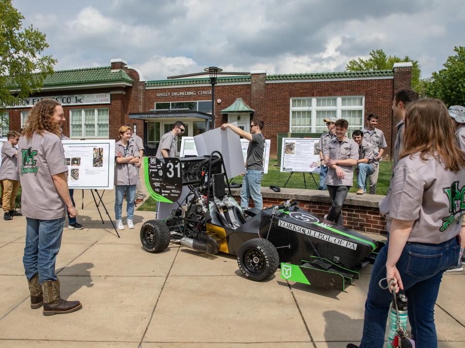 Members of York College's competitive race team apply engineering skills to competitive Formula SAE racing in an exciting capstone design project. With majors in Mechanical Engineering, Computer Engineering, and Electrical Engineering, YCP's student team works collaboratively to design, build, and race a car. Their experience culminates at Michigan International Speedway, where they compete against students from 120 other colleges and universities.
