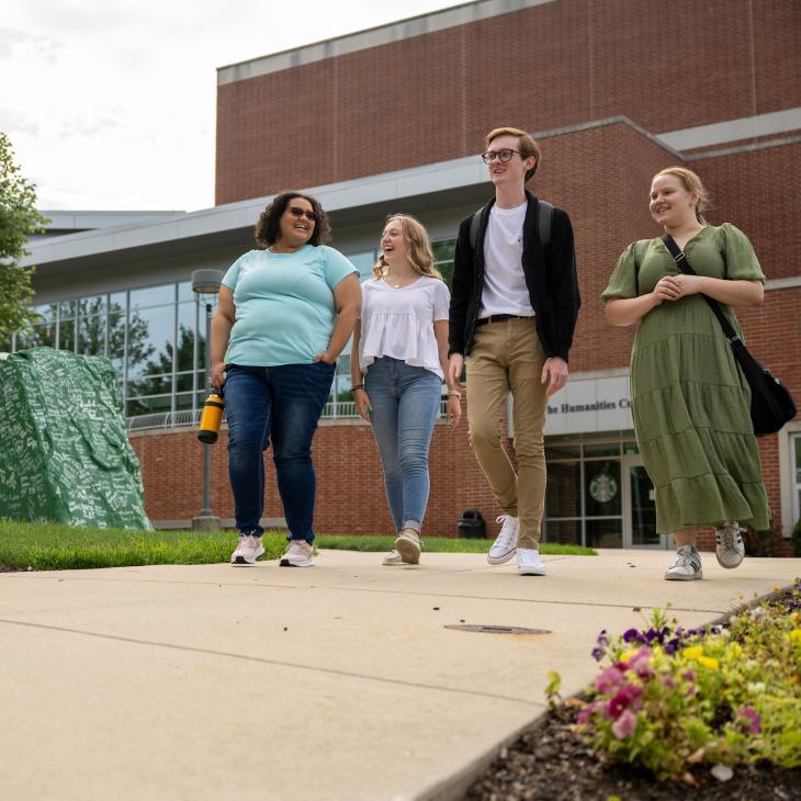 Group of students walking through campus talking to each other.
