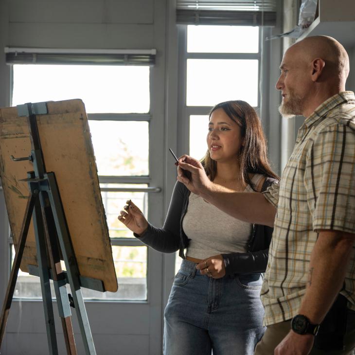 Student and professor drawing on an easel in a classroom