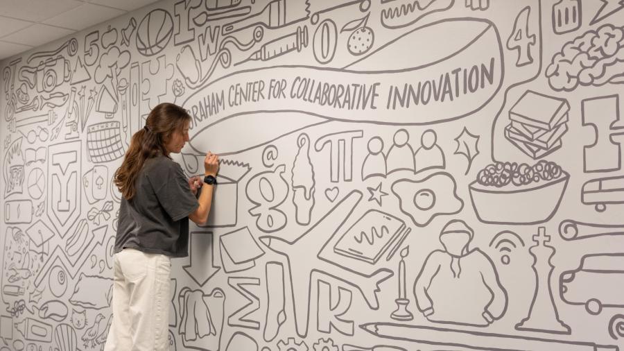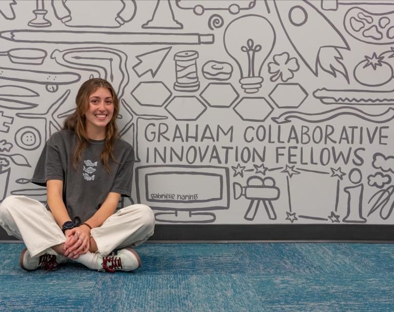 Recently, the Graham Center of Collaborative Innovation (GCCI) had a mural painted in their satellite office, located in the Humanities Center Room 145, thanks to alumna Gabrielle Haring ’24 and her artistic skills.