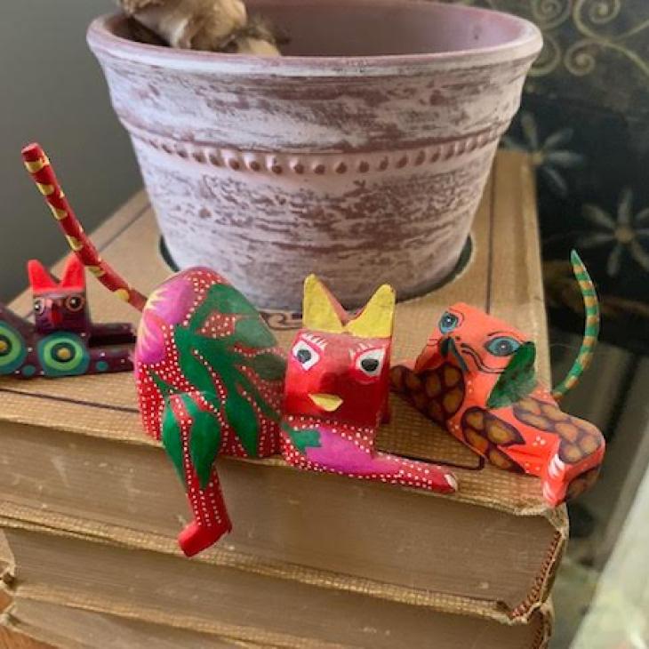 I love traveling, and presently have been to nine countries and 43 states. I’m planning another trip to Mexico this summer, and I usually pick up one of these, which are Mexican folk art depicting fantastic creatures. I’m partial to cat-like ones, since I’m a self-confirmed cat person.