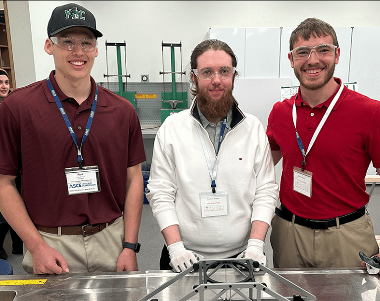 In the end, the final bridge design weighed around 0.87 pounds and had a deflection of 0.6 millimeters (less than 1/32nd of an inch) at the target load of 25 pounds. The team’s bridge won first place in several of the individual categories, and with its total score, it won first place overall—a first in York College ASCE competition history.