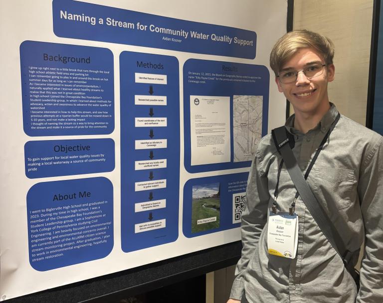 It is an achievement he is quite proud of. Aidan completed it with the help of the Chesapeake Bay Foundation (CBF), a nonprofit organization dedicated to preserving the Chesapeake Bay. When the organization reached out to Aidan nearly two years later about doing a poster presentation about his project for the 2024 North American Association for Environmental Education (NAAEE) conference, he was more than happy to share his experience with other environmental enthusiasts.