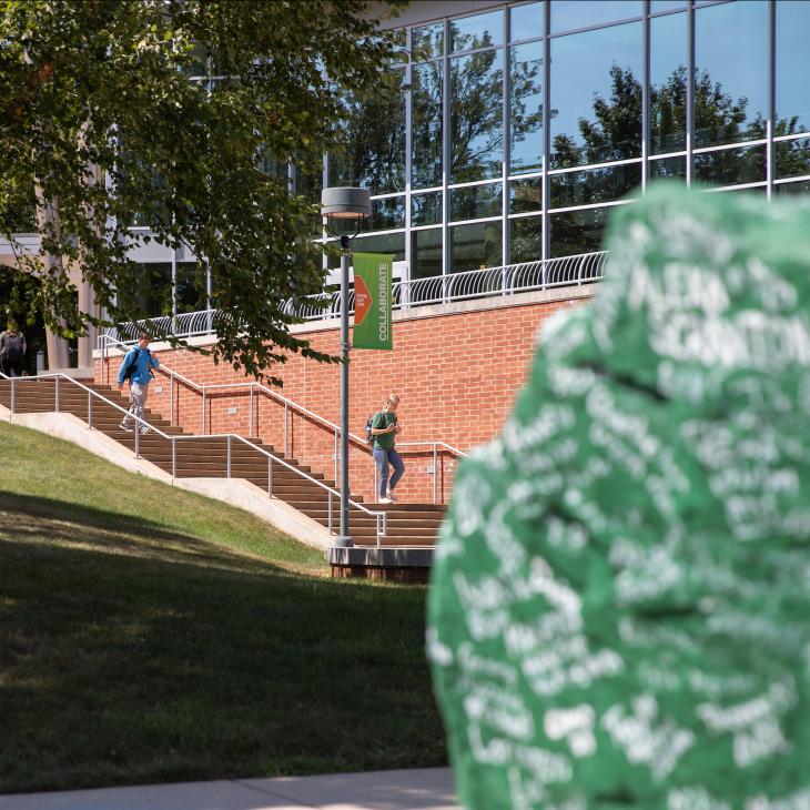 Students walk down outdoor steps beside the Performing Arts Center building. In the foreground, Ol Spart (a green boulder covered in white painted signatures) is visible.