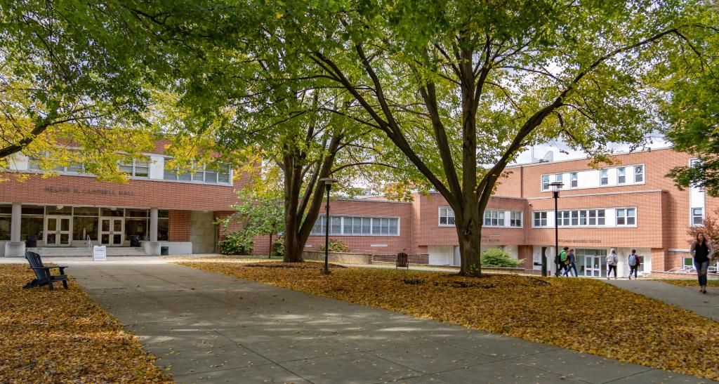 An exterior photo shows the brick front of Campbell Hall and a sidewalk lined with trees.